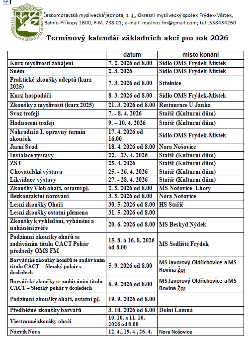 | Náhradní a Opravný termín zkoušky z myslivosti | 23.4.2025 | Sídlo OMS FM |